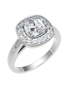 A lush selection of quality hand-picked stones surround this picturesque cushion cut centre. With a classic band to match, this stylish ring will capture the moment as well as their heart. Available in Platinum, as well as Yellow, Rose and White Gold in all karats. Please contact us to tailor this product.