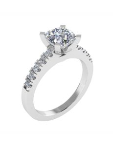 This stunning cushion cut, with a size of your choice, is embedded within a 4-prong setting. With 10, natural round cut diamonds filling the band – this masterpiece is a reflection of beauty. Available in Platinum, as well as Yellow, Rose and White Gold in all karats. Please contact us to tailor this product.