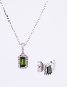 Green Tourmaline and Diamond Necklace and Earrings, set in 9k White Gold