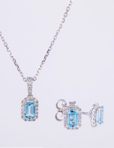With a vibrant gemstone and a classy diamond surround. These subtle pieces will effortlessly add class as they radiate glamour for everyday wear or special occasions. With a choice of colours to choose from, this stylish necklace and earring combination will be the sparkle in the room. This product is also available in Pink and Green Tourmaline. This product also comes in a box with a 375 stamp of approval.